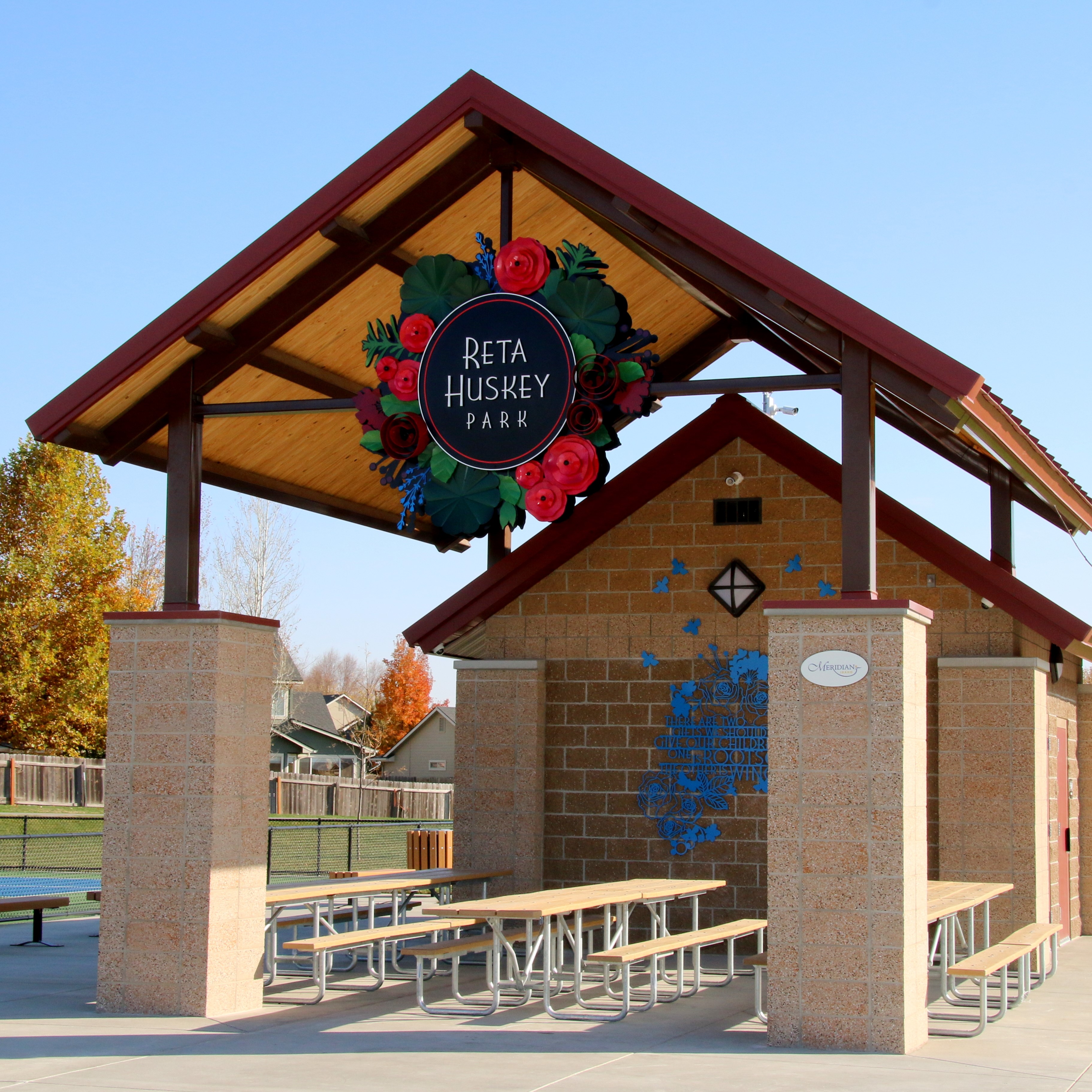 Reta Huskey Park, a 9-acre neighborhood park established in 2017, is located off N. Ten Mile Road in Meridian’s Bellano Creek subdivision. The park is named after Reta Huskey, a woman who grew up on the property, along with her five siblings, when it was a 120-acre ranch. It includes several design elements that pay tribute to Reta Huskey’s devotion to her family and her love of flowers.